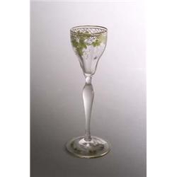 farbloses Glas. Auf Fuß und Kuppa Bemalung eines Weinrankendekors in Gold und grüner Emailfarbe. Über rundem Tellerfuß sich erweiternder Schaft mit kelchförmiger Kuppa. H.: 14 cm. Unbezeichnet. Um 1905
