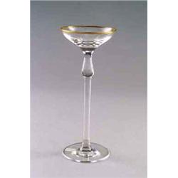 THERESIENTHALER KRISTALLWARENFABRIK, Theresienthal Likörglas, farbloses Glas mit Goldbemalung. Tellerfuß, gerader Stiel mit tropfenförmiger Verdickung unter der schalenförmigen Kuppa mit Goldrand. H.: 16 cm. Unbezeichnet. Um 1900