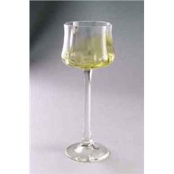 THERESIENTHALER KRISTALLWARENFABRIK, Theresienthal Weinglas, farbloses Glas, partiell hellgrün überfangen. Tellerfuß, schlichter Schaft, Kuppa mit kugeloptischem Dekor. H.: 20,5 cm. Unbezeichnet. Um 1904 Lit.: Warthorst, K.W., Die Glasfabrik Theresienthal, Freiburg 1996, Abb.S. 67.