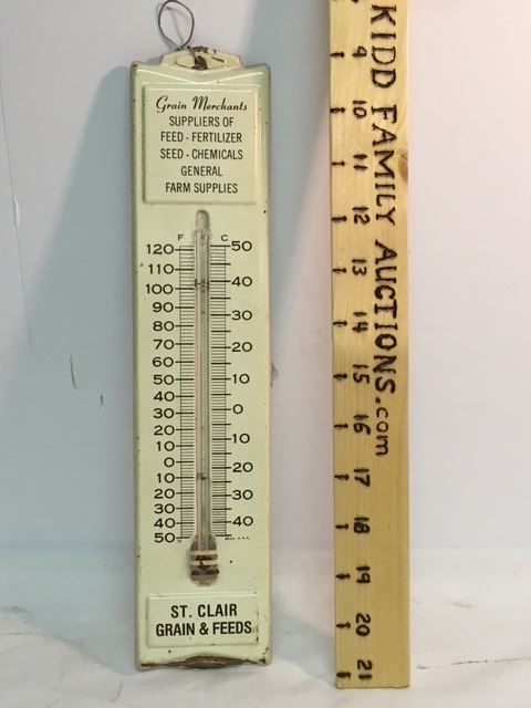 ST CLAIR GRAIN & FEED, APPROX 12" TIN THERMOMETER.