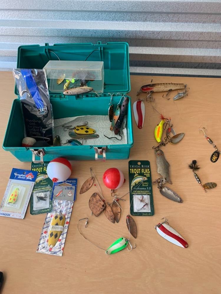 THERMOS LUNCH BOX WITH CONTENTS. LURES FLOATS ETC
