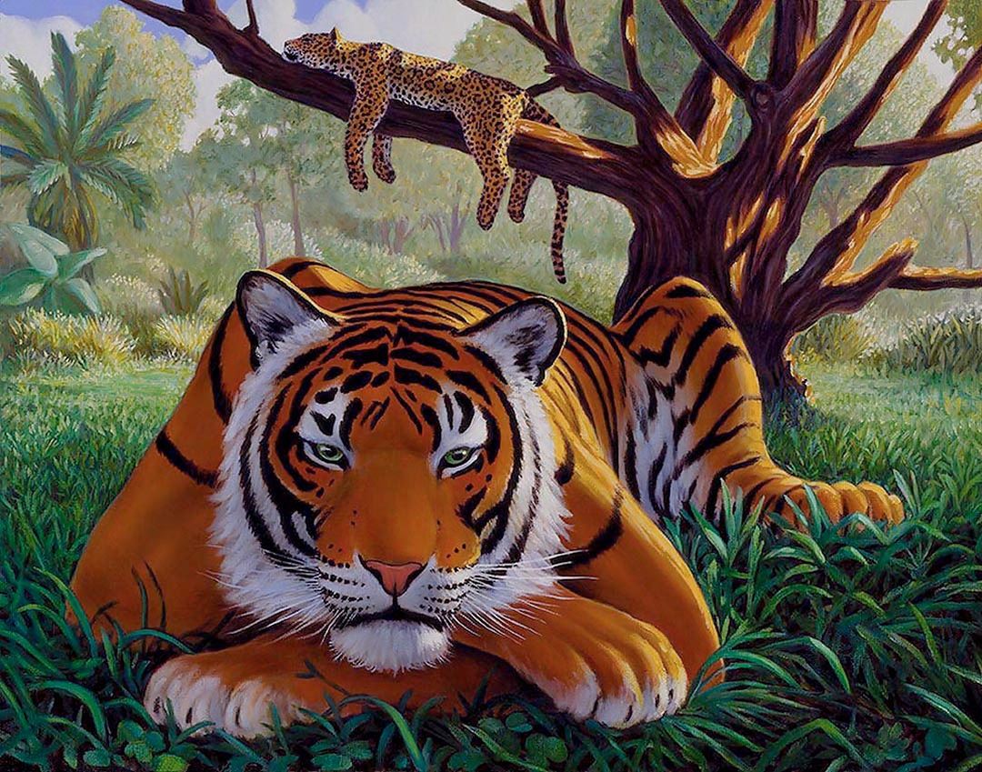 Giclee on canvas, limited edition by Charles Lynn Bragg. A Tiger and a Leopard take an afternoon break. 14 x 11