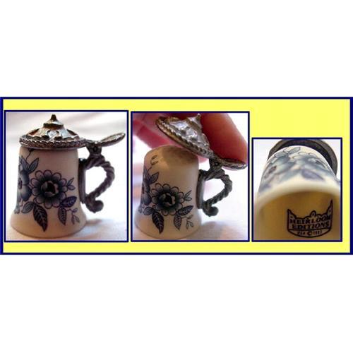 Unusual thimble in the form of a beer stein or tankard. Very realistic miniature, even the handle lifts up.