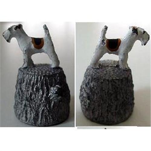 Fabulous thimble made of a grey metal in the form of a tree stump. On top of this proudly stands a champion Airedale terrier dog, painted in cream, brown and black enamel. Marvellous moulded detail to face and legs. The raised lettering inside the thimble is illegible. Thimble is in very good condition. No damage of any sort, with minor acceptable wear to the paint. A fabulous, fun piece. see other thimbles in this collection.