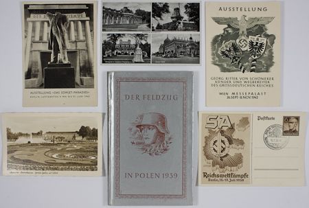 Grouping of various ephemera related to the Third Reich, includes: two postcards related to the "Soviet Paradise" exhibit held in Berlin, May 9-21, 1942, includes a postcard bearing a photo of a shattered statue beneath and inscription: "The translucent facade of Bolshevism", the second card bearing a printed cancel promoting the exhibit and showing impoverished Russians; a postcard promoting an exhibition and bearing a Sept. 26, 1942 Vienna cancel both honoring George Ritter von Schonerer (1842-1921), an Austrian politician active in the late nineteenth and early twentieth centuries and a major exponent of German nationalism in Austria; postcard honoring the S.A. and sports games, July, 1938; a postcard with an S.A. commemorative cancel; and a book The War in Poland 1939, (Deutsches Verlags-Expedition: Stuttgart), 8vo., unpaginated, contains printed speeches by Hitler, narrative on the conquest of Poland, and multiple photos of principal officers, troops and mayhem. Six pieces.
