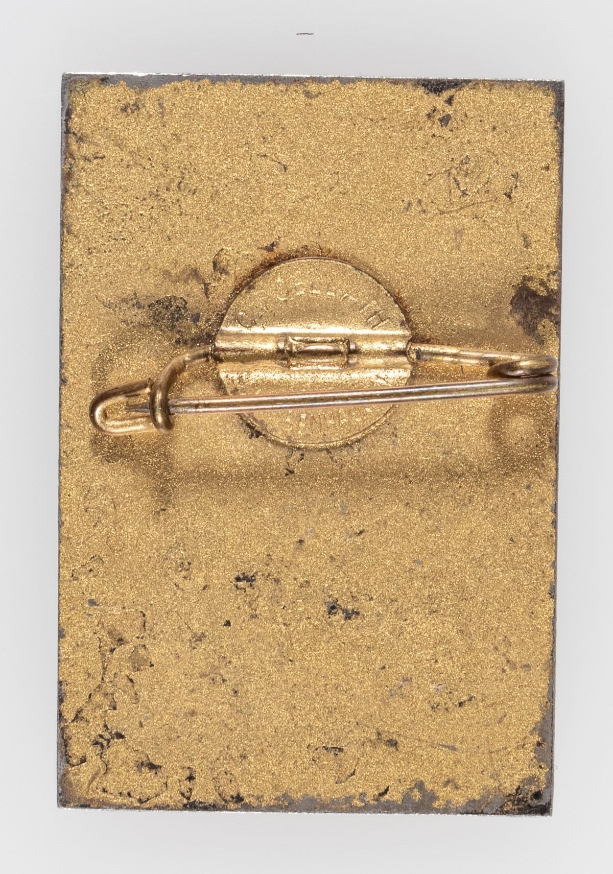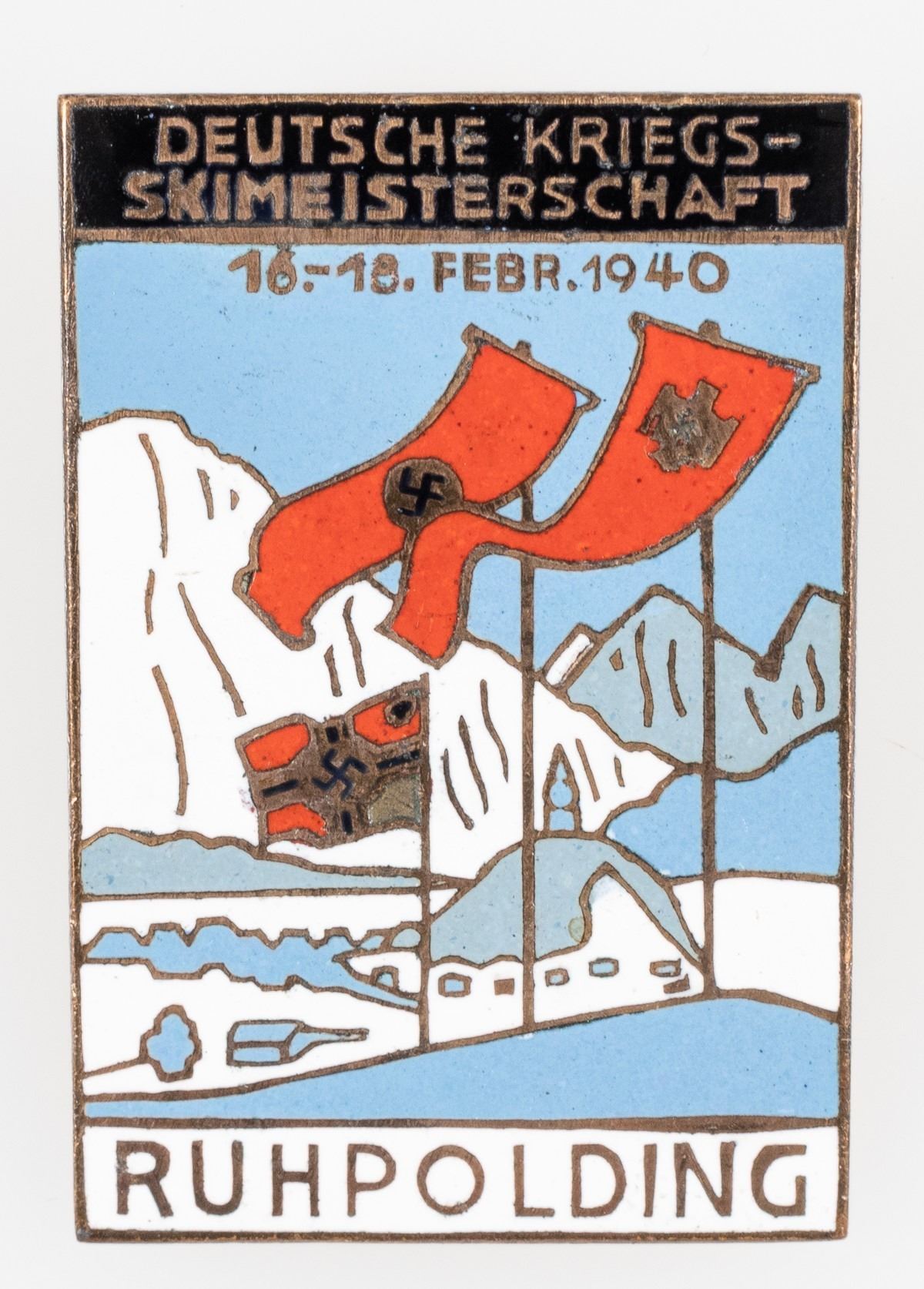 German WWII pin for the 'German War Ski Championship' ('Deutsche Kriegs-Skimeisterschaft') held in Ruhpolding on 16.-18. February 1940. The enamel pin shows three Nazi flags blowing in the wind on a snowy mountain top. Safety pin back. Marked 'C. Poellath - Schrobenhausen'.