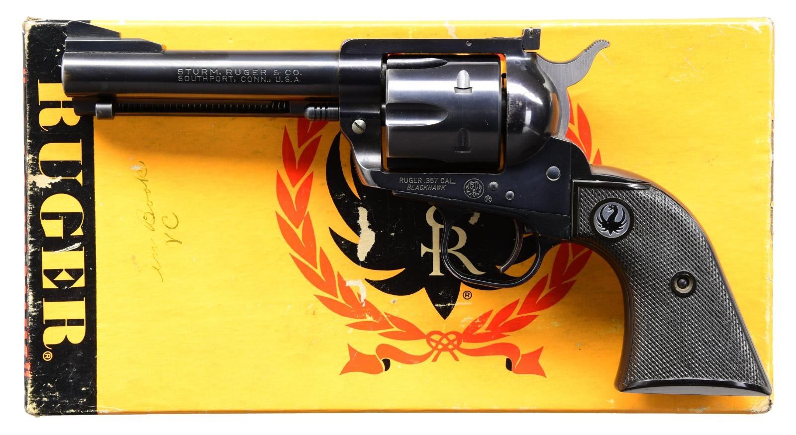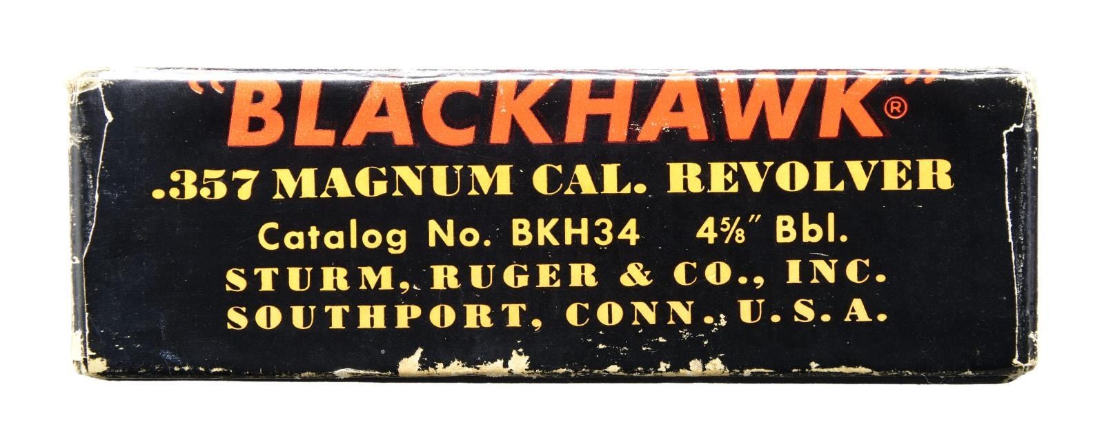 Cal. 357 Mag. S# 8373. Bbl. 4 5/8" (6 groove) with ramped serrated blade front sight; Micro rear sight (elevation screw index marked) on flat topped cylinder frame. Mfg. 1957 (1955-1962) as BH34 with all transition Type 2 (scarce; about 1,800 units from S# 7407-9521) features: front sight, long throw offset ejector housing, dimpled ejector rod head, narrow lands on base pin, capped base pin latch, "XR3 ALCOA G" marked grip frame, checkered black hard rubber grips with black eagle medallions, small "S" cylinder proof, no "INC." in barrel address, "skinny" trigger, original lockwork without factory safety update plus subdued plum tone to loading gate. UNATTACHED ACCESSORIES: correct 2 piece yellow / black box without barrel length on label. Light edge / corner scuffs, areas where tape has been removed "in Book VC" by pen on lid having patina. CONDITION: very good to excellent overall appearance of original finish having minimal thinning at muzzle area to include ejector housing end plus loss on trigger guard and each lower corner of butt. Near excellent bore and grips. (23-6587/NW). CURIO. $800-1,200.