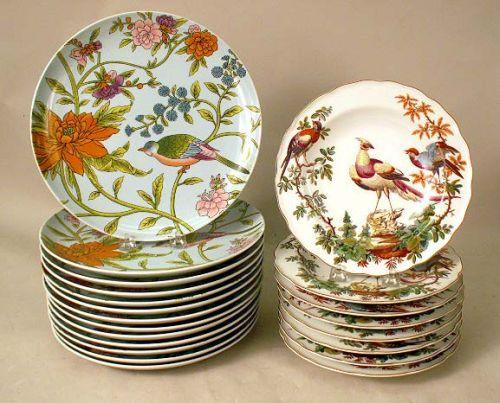 The undersides stamped Blue Bird, by the Haldon Group. Chips and wear. 10 1/4"dia. Together with eight rim bowls with a bird design, the undersides stamped Williamsburg Restoration, Mottahedeh, VA, 1824 Portugal. 8"dia. 21 pieces.