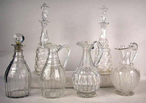 THIRTEEN COLORLESS GLASS DECANTERS AND PITCHERS; losses