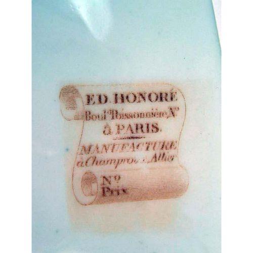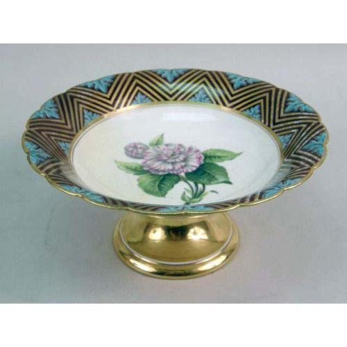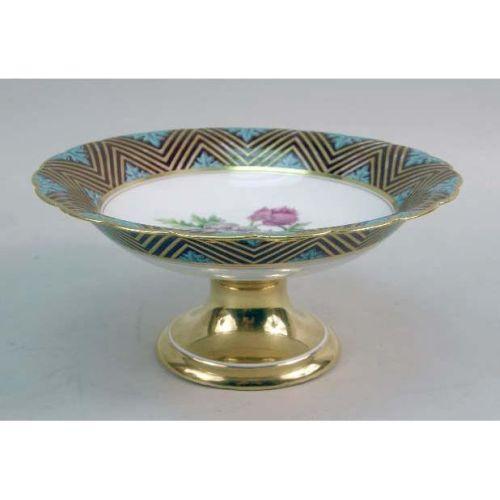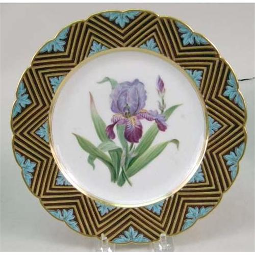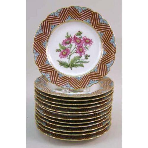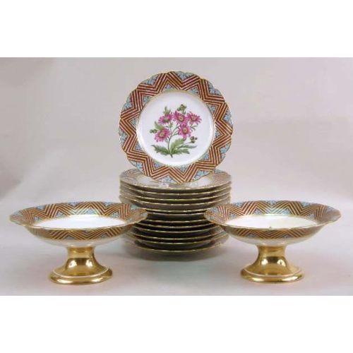 THIRTEEN HAND-PAINTED AND GILT-DECORATED LUNCHEON PLATES<BR><BR>Together with two footed serving dishes, France. Each stamped "E.D. Honore/Boul`d Poissonniere No./a Paris/Manufacture a Champroux Alber," two plates and one bowl with minor paint loss on rim. 15 pieces
