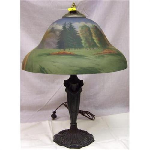 THIS IS A WONDERFUL GLASS LAMP THAT THE SHADE HAS BEEN HANDPAINTED UNDER GLASS.IT IS BEAUTIFUL, AND PICTURES ROLLING HILLS AND TREES WITH A CASTLE ON THE TOP OF HILL. IT ALSO SHOWS A ROAD GOING UP THE HILL.THE COLORS ARE GREEN,BRICK, SAND, WHITE AND BLUE. IT DOES HAVE A CHIP ON THE EDGE OF GLASS TOP. ABOUT 1/3 INCH. IN ALL IT IS IN GREAT SHAPE. YOU LAMP COLLECTOR'S CHECK THIS OUT !!!