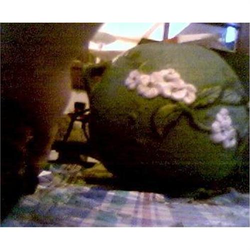 UNFORTUNATELY THERE WERE PEOPLE THAT TRIED TO REPRODUCE ORIGINAL ROSEVILLE POTTERY. FORTUNATELY THERE WERE SOME WONDERFUL PIECES MADE AND THIS POT IS ONE OF THEM. IT IS MARKED CLEARLY ON THE BOTTOM ROSEVILLE 751-7". IT IS NOT A ROSEVILLE AUTHENTIC MARKING. BUT THE CRAFTSMANSHIP IN THIS PIECE MAKES ME LIKE IT AS MUCH AS THE ORIGINAL. IT IS A BEAUTIFUL GREEN POT WITH A SIMPLE WHITE FLOWER AND GREEN LEAVED VINE. THE POT ITSELF IS RAISED IN PLACES AND THE DARKER GREENS ARE SITUATED AROUND THE BOWL SUCH AS AROUND THE HANDLES AND IN THE LEAVES THAT ENHANCES THIS PIECE TO AN ABSOLUTE BEAUTIFUL PIECE. THIS IS QUITE A HEFTY PIECE AND IS JUST BEAUTIFUL THE SMALL RED DOTS INSIDE THE BLOOM OF THE WHITE FLOWERS GIVES IT JUST ENOUGH COLOR TO EXCITE YOU. IT IS JUST AN ABSOLUTELY WONDERFUL REPRODUCTION AND I APPRECIATE YOU LOOKING AT IT AND WISH IT COULD HAVE BEEN A "REAL" ROSEVILLE, BUT IN ITS OWN RIGHT IT IS A REAL DEAL.