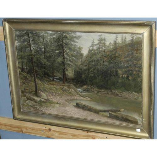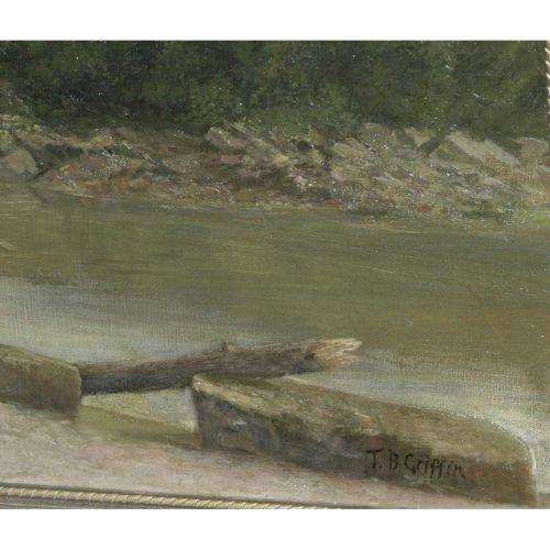 THOMAS BAILEY GRIFFIN, 21"x31" oil on canvas, Shoreline of a Stream, CONDITION REPORT: small old patch verso, but front looks excellent. no inpainting.