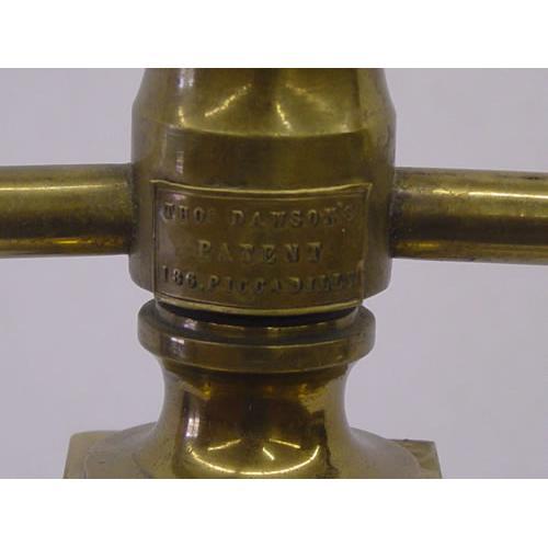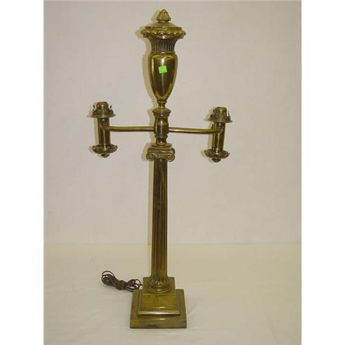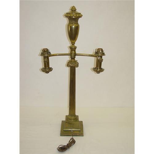 THOMAS DAWSON'S ENGLISH BRASS NEOCLASSICAL DOUBLE BURNER OIL TABLE LAMP W/ IONIAN COLUMN BASE-BRASS TAGGED THOS. DAWSONS PATENT 186 PICCADILLY (ELECTRIFIED; 36" T X 17" W) - WEAR, MISSING CHIMNEYS & SHADES, IMPERFECTIONS