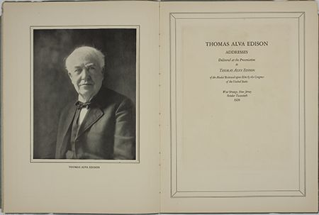 A scarce Edison-related imprint, Addresses Delivered at the Presentation to Mr. Thomas Alva Edison of the Medal Bestowed Upon Him By the Congress of the United States, 28pp. 9" x 12", [n.p., ca. 1928], three plates. On Oct. 20, 1928, the 49th anniversary of the invention of the incandescent light, Edison was awarded the Congressional Gold Medal at his laboratory in West Orange. This volume, printed on high-quality rag, bears the texts of speeches and comments made at the event by Edison, President Calvin Coolidge, Andrew W. Mellon, and other dignitaries. Some slight offsetting from the plates, and one small corner of the front cover is heavily soiled, else very good. Sold with a check issued by the Edison Botonic Research Corp, West Orange, Oct. 6, 1930, making a $47.19 payment to "H. Gibbs", signed by the company's vice president and treasurer. Two pieces.