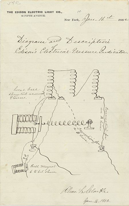 CHARLES LORENZO CLARKE (1853 - 1941) Longtime associate of Thomas Edison who began working for the inventor in his Menlo Park laboratories in 1880 and later made chief of the Edison Electeric Light Company in New York and later General Electric in Schenectady until his retirement in 1931. A scarce, original ink drawing Signed "Chas. L. Clarke" 1p. 8vo. on "THE EDISON ELECTRIC LIGHT CO.", New York, Jan. 16, 1882 being a "Diagram and Description of Edison's Electrical Pressure Indicator" Usual folds, light soiling else very good condition.