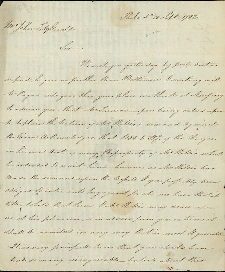 (1741 - 1811) Signer of the Constitution and influential in founding the Bank of North America and in obtaining the protective tariff. War-date A.L.S. "Thos. Fitzsimmons", 2pp. 4to., Philadelphia, Sept. 20, 1782 with integral address leaf to John Fitzgerald in Alexandria, Va.. In part: "...We wrote you yesterday by post but as we find he goes no further than Baltimore & meeting with Mr. Pagan who goes through your place we find it necessary to advise you that Mr. Trinian upon being called upon to explain the nature of Mr. Willis' demand...Mr. Willis has made the demand upon the Vessel...the property of Mr. Willis which he intended to remit him...Mr. Willis has made the demand upon the Vessel...Mr. Willis may draw upon us at his pleasure...it shall be remitted in any way that is most agreeable...It is very painful to us that you should have had so many disagreeable contacts...". Also signed by GEORGE MEADE, grandfather of the Union general of the same name. John Fitzgerald was an aide to George Washington and a co-director of Washington's Potomack Company. Two tiny spindle holes bear archival tape patches in blank areas on verso, two dime-sized toned spots from seal, else very good.