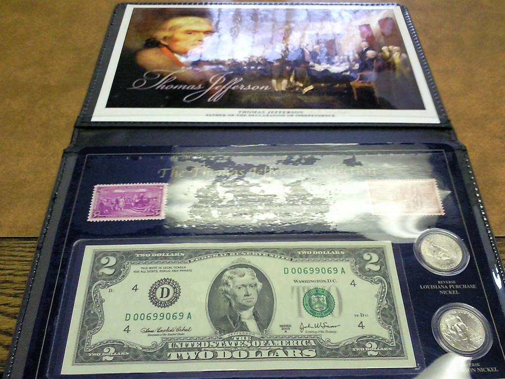 CONTAINS: UNC $2 NOTE, 2 NICKELS AND 2 STAMPS