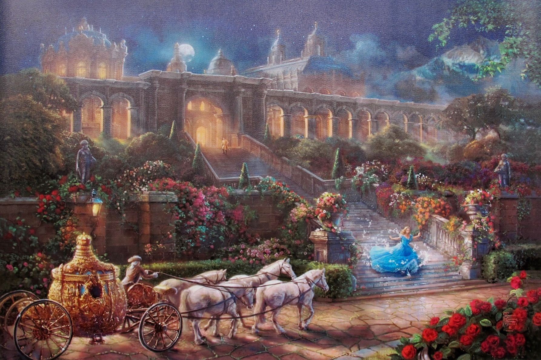 This is a reproduction giclee on canvas by Thomas Kinkade titled “Cinderella Clock strikes Midnight” Measures: 12? x 18?. Beautiful rich colors! Comes unframed, un-stretched. Excellent condition!