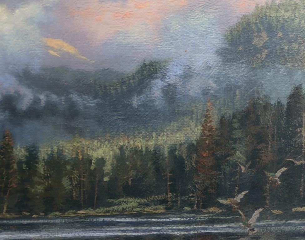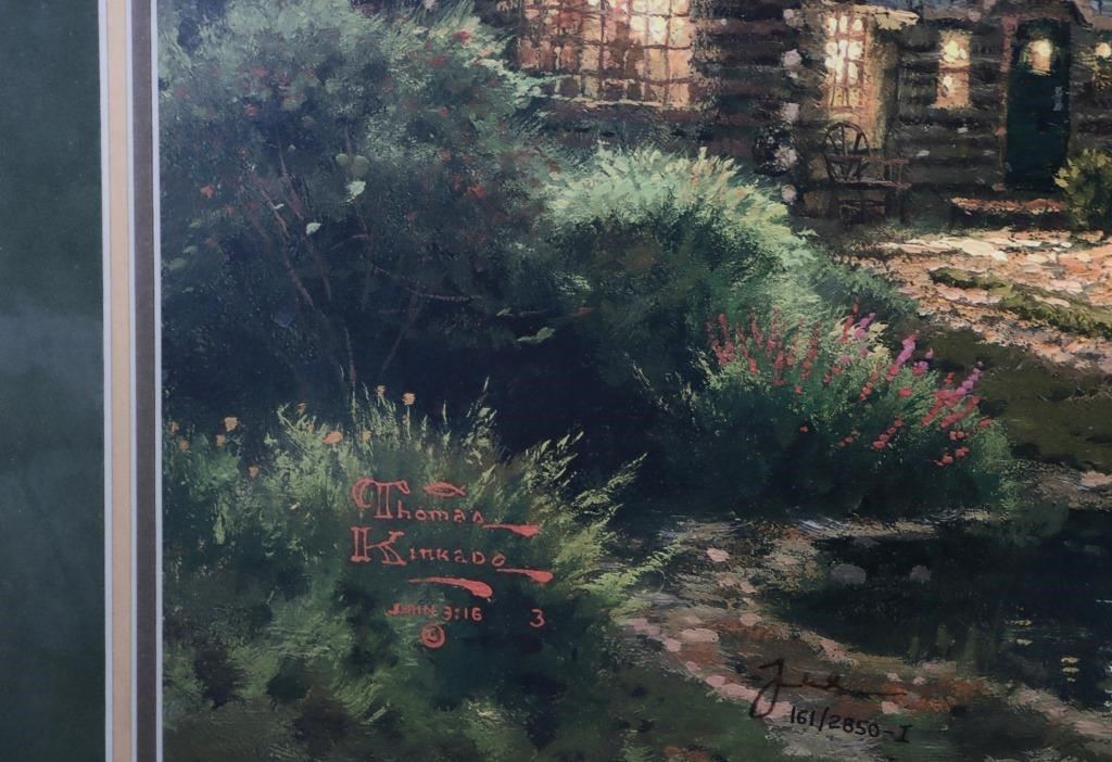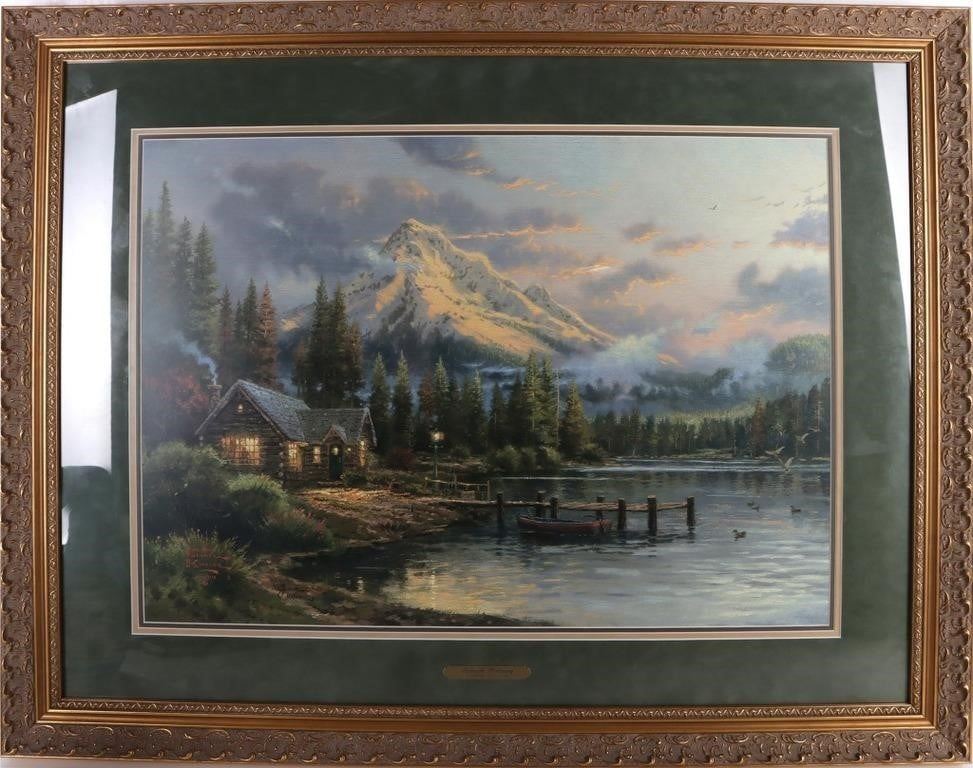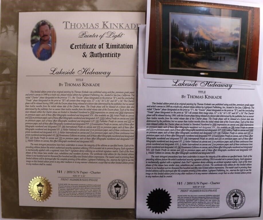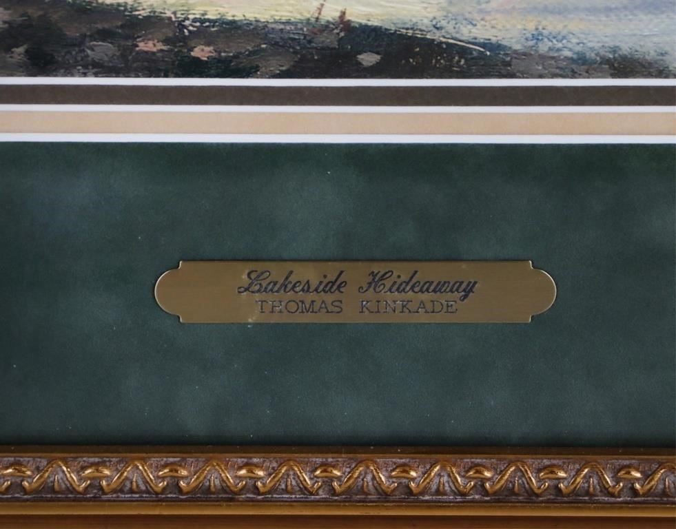 Thomas Kinkade "Lakeside Hideaway" limited print 161/2850 w/ COA framed to include a nice nameplate and two COA's to confirm the print. William Thomas Kinkade III was an American painter of popular realistic, pastoral, and idyllic subjects. He is notable for achieving success during his lifetime with the mass marketing of his work as printed reproductions and other licensed products by means of the Thomas Kinkade Company.