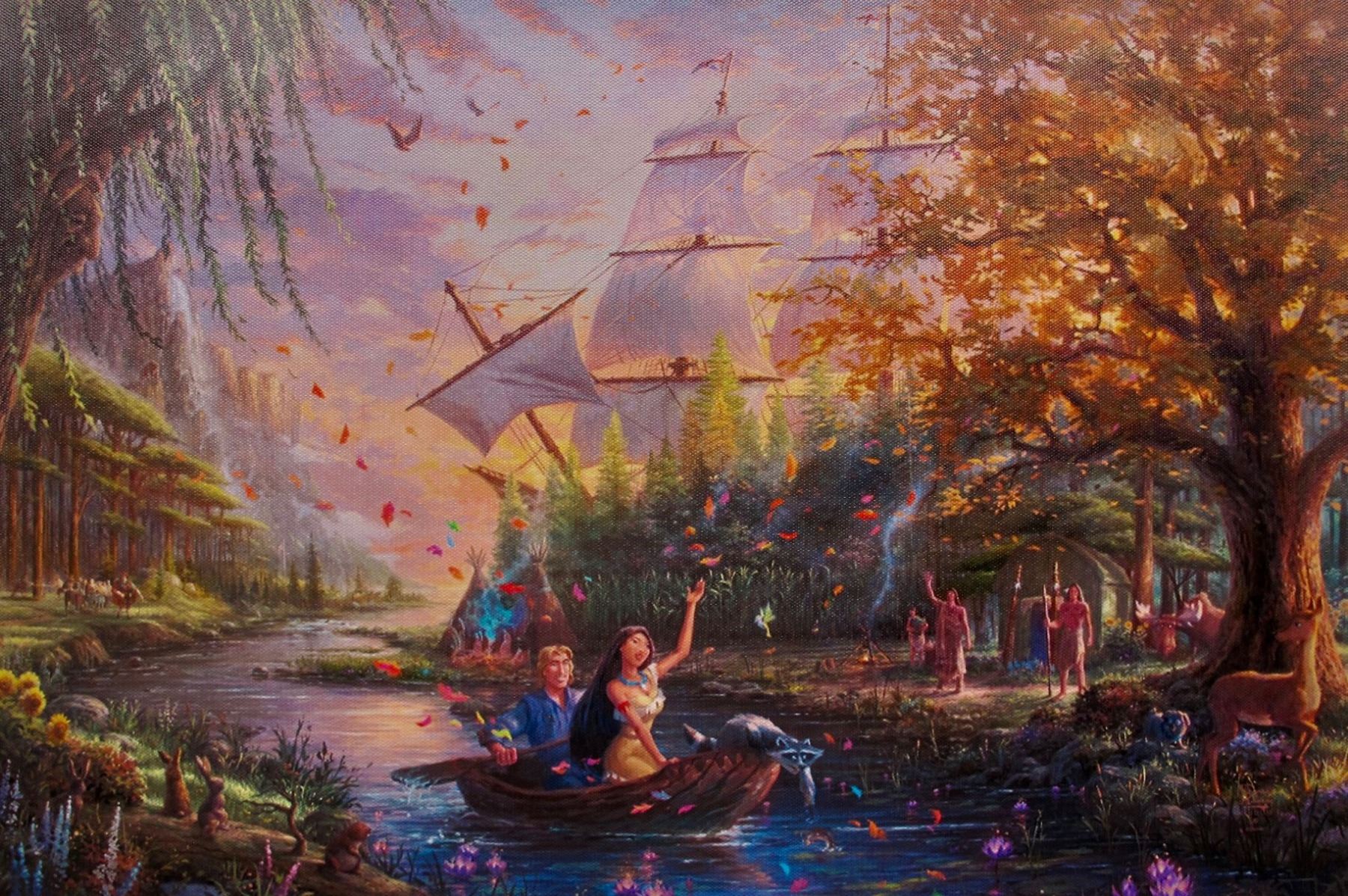 This is a reproduction giclee on canvas by Thomas Kinkade titled “Pocahontas” Measures: 12? x 18?. Beautiful rich colors! Comes unframed, un-stretched. Excellent condition!