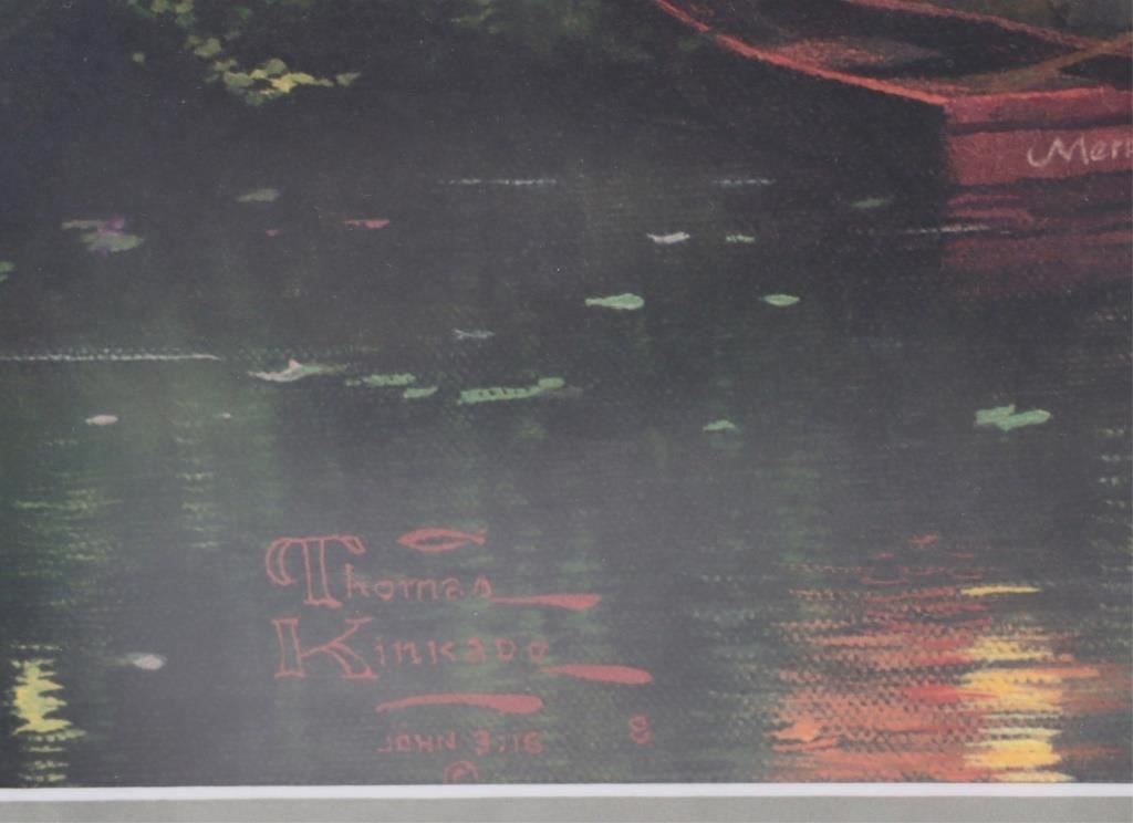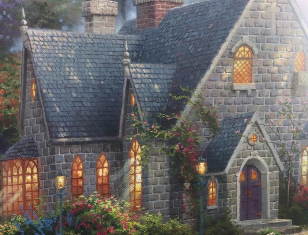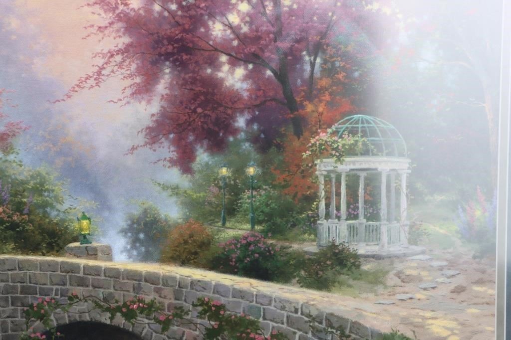 Thomas Kinkade(1958-2012) signed "Lamplight Manor" limited canvas lithograph 272/880 framed. William Thomas Kinkade III was an American painter of popular realistic, pastoral, and idyllic subjects. He is notable for achieving success during his lifetime with the mass marketing of his work as printed reproductions and other licensed products by means of the Thomas Kinkade Company.