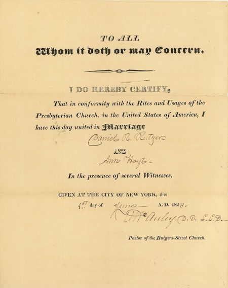 (1778 - 1862) American radical Presbyterian clergyman who became pastor of the Rutgers Street Church, New York City, in 1822. A leader in the general assembly at which the old-time adherents took action, resulting in a division of the church. Founder and first president of the Union Theological Seminary, 1835. Fine and important partly-printed D.S. 1p. 4to., June 3, 1828, a marriage certificate that reads, in part: "...I do hereby certify that in conformity with the rites and usage of the Presbyterian Church...I have this day united Daniel R. Rutgers and Ann Hoyt, in the presence of several witnesses...". A nice association piece linking two of the most powerful New York religious figures of the nineteenth century. Fold tears expertly mended, overall very good.