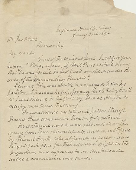 (1813 -1908) Confederate brigadier general who surrendered to Union forces at Vicksburg, he later commanded a brigade under Walker in the Red River campaign.Superb contanet A.L.S., 2pp. 4to., Nyland, Texas, Jan. 31, 1898 to Dr. Jno. O. Scott. Waul recollects events at the battle of Jenkins Ferry on April 30, 1864, during Steele's disastrous Camden Expedition. He writes, in part: "...General [Sterling] Price was unable to advance or hold his position...I was ordered to the front by Genl. [E. Kirby] Smith to occupy and drive the enemy. In our advance we met and passed through General Price's command, then in full retreat...[we] met and drove the enemy fromt their intrenchments, and were stopped by General Smith who appeared in person and thought...a farther advance might be too hazardous...until a reconnaisance was made. Scurry and Randall's Brigades were on my right...under the conmmand of General Walker...we won a decided victory, and the enemy...crossed the river that evening and night in disorderly and rapid retreat. Without artillery or cavalry the Confederates depended upon muskets and bayonets, and the conflict was a fair test of the courage and endurance of our troops...". Mounting strip at top of second page, chip at top, else very good.