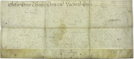 (1702 - 1775) Son of William Penn who managed the Pennsylvania proprietorship in person, resolved boundary disputes and eventually controlled 25 million acres of land. Manuscript D.S. "Tho Penn"1p. oblong folio on vellum, Philadelphia, Apr. 25, 1741, a grant of 120 acres of land to Jacob Marlin of Lancaster County "...Situate [on] Branch of Conestoga Creek..." Holes surrounding signature where seal and ribbon were once affixed, moderate toning at folds, light soiling, text light at folds, else very good condition with a nice, large signature.