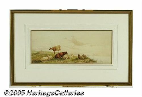 <B>THOMAS SIDNEY COOPER (British 1803-1902)</B></I>Cows and Sheep Resting by a Lake, 1867<BR>Watercolor on board<BR>8.75in. x 20.25in.<BR>Signed and dated lower right<BR><BR>Condition Report: Margins are deteriorated from tape residue and scuffing, image is somewhat faded from light exposure<BR>