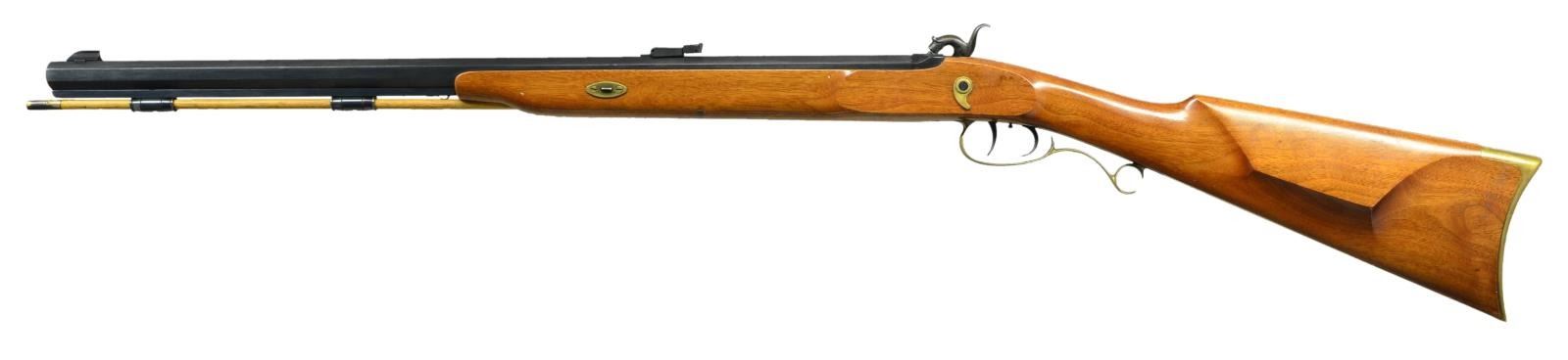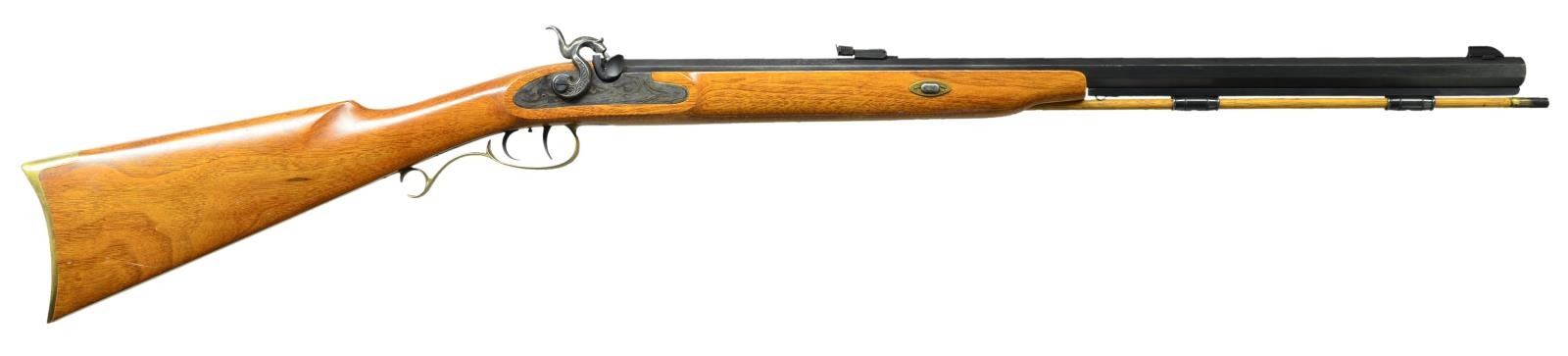 Cal. 32. S# 4611. Bbl. 24" oct. w/ dovetailed bead front sight & adjustable rear. Mfg. mid 1980's to approx. 1994. Stock differs from Seneca Model in that it has less fittings & no patchbox. Twist rate of 1 in 30" for this ideal "squirrel gun" w/ its double set triggers & brass trim. CONDITION: very good plus appearance having slight tarnish on brass components. Some light marks on toe line of stock. Near excellent bore. (01-21102/NW). ANTIQUE. $350-500.