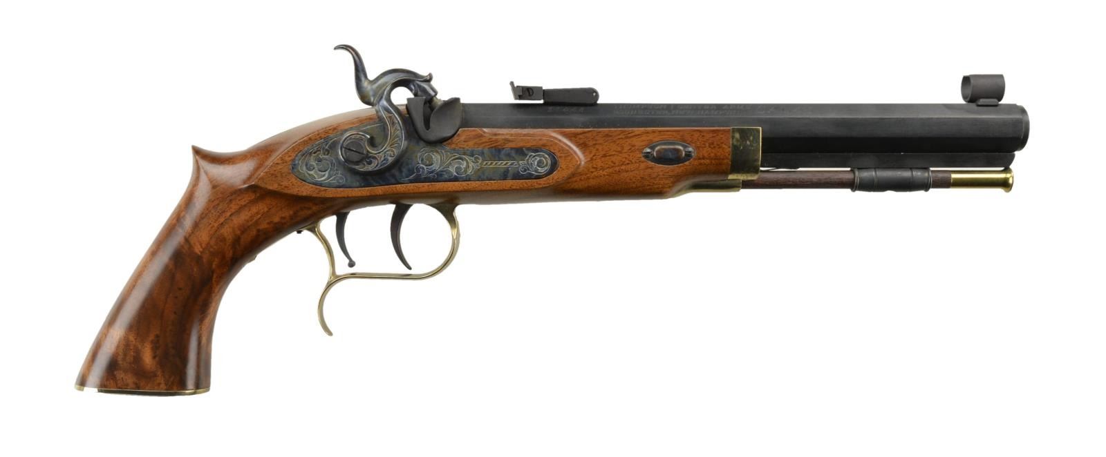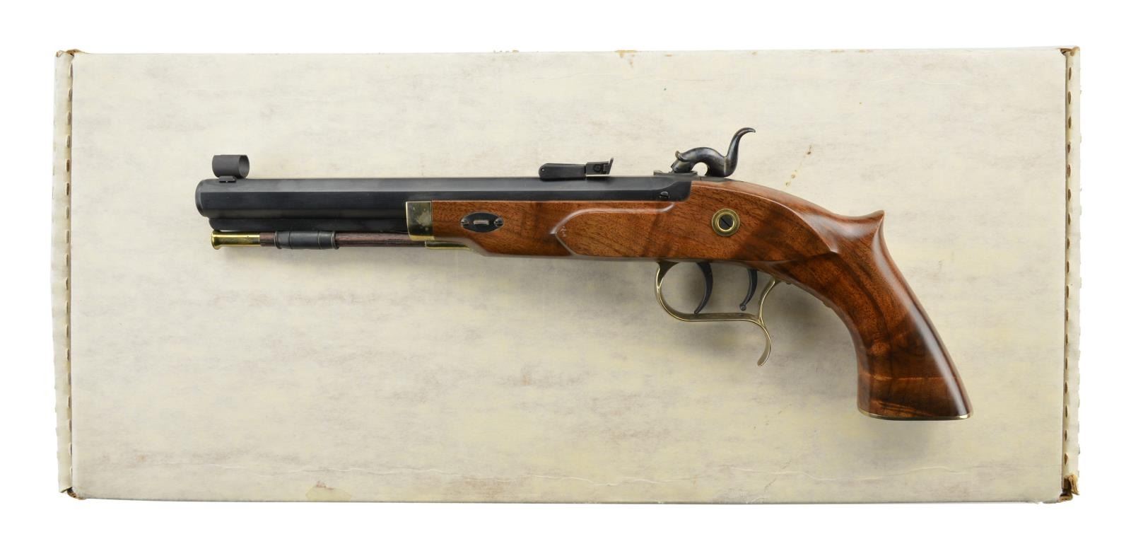 Cal. 45. S# 21443. Bbl. 9" oct. w/ protected post front sight & adjustable rear. Mfg. ceased in 1997 due to extensive fire at Rochester, NH factory that also took out production of Seneca & Scout muzzle loaders as well. Classic design of superior quality having case colored lock plate & hammer actuated by double set triggers. Nicely figured walnut stock w/ brass accents to include grip cap having initial oval at center. UNATTACHED ACESSORIES: Original box w/ normal packaging plus T/C accessories: #727 bullet starter, #703 pack of precut patches & #722 powder measure. CONDITION: extreme scrutiny will yield small spots of tarnish on brass components but overall near excellent including bore. (01-21112/NW). ANTIQUE. $350-500.