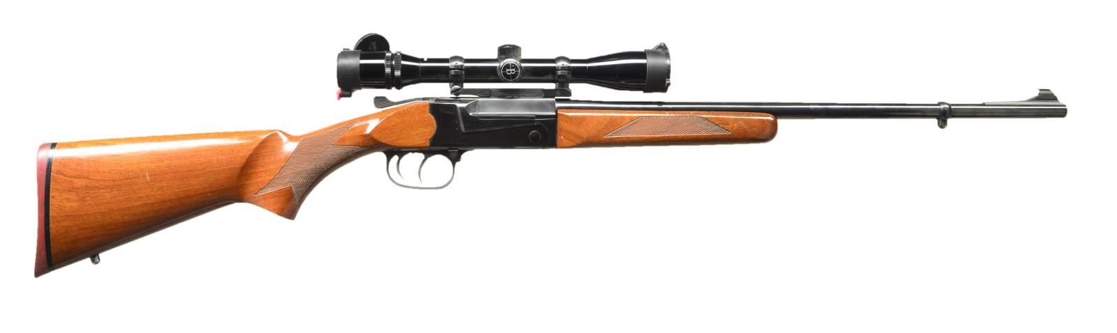 Cal. 270 Win. S# 7881. Bbl. 23" w/ ramp mounted bead front sight, 2 plug screws for rear sight base & band for sling swivel mount. Bushnell Scopechief IV 4x scope w/ crosshair reticle & Butler Creek scope caps one Redfield 1 piece base & rings. Dbl. set triggers. Checkered walnut stock set w/ cheekpiece, sling stud & red recoil pad. CONDITION: very good overall blue & wood finish w/ handling marks scattered throughout commensurate w/ use. Forearm blue exhibiting plum tone. Very good shiny bore. Scope has very good finish w/ clear serviceable optics. (22-3342/MD). MODERN. $400-600.