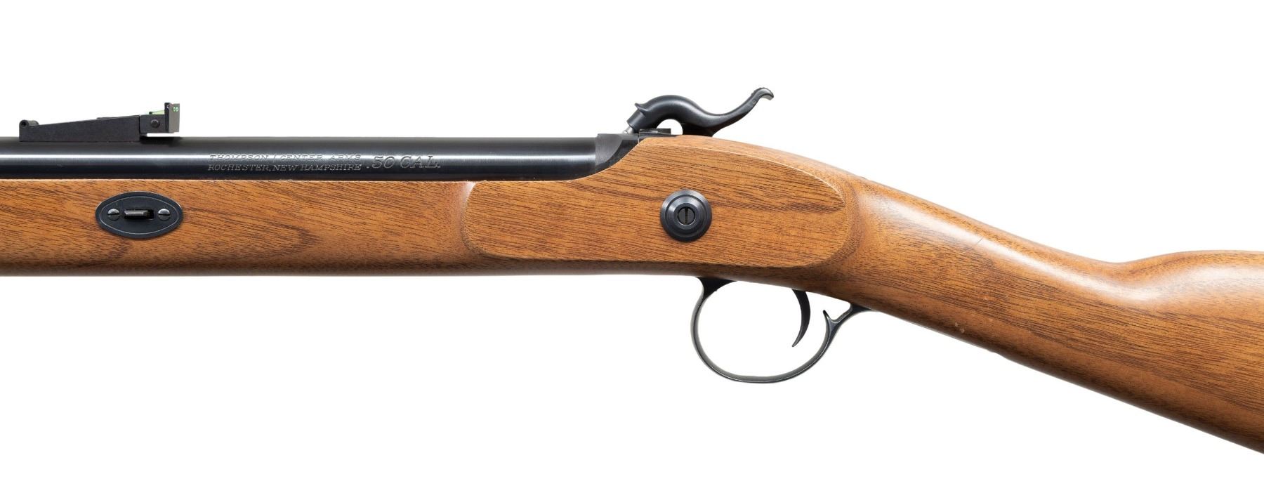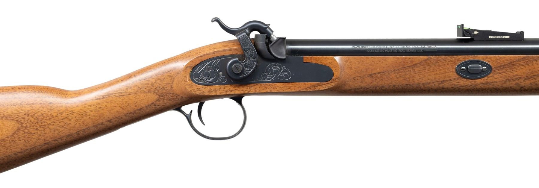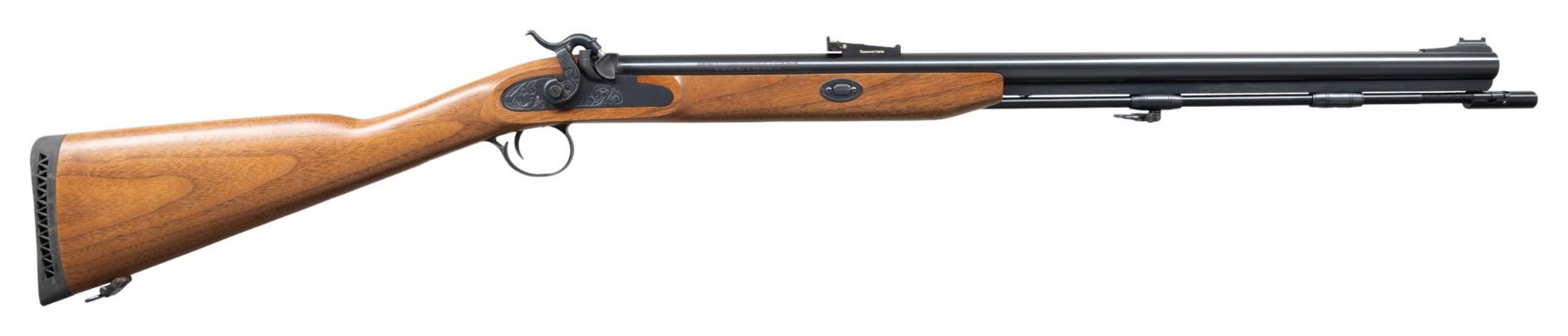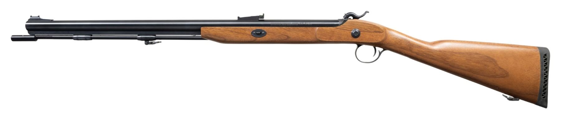 PERCUSSION RIFLE. Cal. 50. S# 4996. Bbl. 26". Black Mountain Magnum percussion rifle mfg. by Thompson Center Arms. Left side of the bbl. is marked with Thompson Center Arms' mfg. information and the cal. designation, with the model designation marked across the top. Metal components exhibit a blue finish, with the lockplate assembly and breech exhibiting a dull blue finish. 1-piece plain wood straight grip stock with "TC" logo grooved black rubber ventilated recoil pad. Ramped blade front sight (fiber optic absent) with green fiber optic U-notch rear sight. Complete with blued steel ramrod. UNATTACHED ACCESSORIES: scans of Thompson / Center Arms 1999 Catalog #26. CONDITION: fine, with metal components retaining virtually all of their original factory blue finish overall, save for a few light superficial handling marks. Mirror bore, retaining well defined rifling throughout. Proper manual mechanics. Stock shows a few superficial marks and minor impressions, but otherwise remains very good overall. (01-28127/MLW). ANTIQUE. $200-400.
