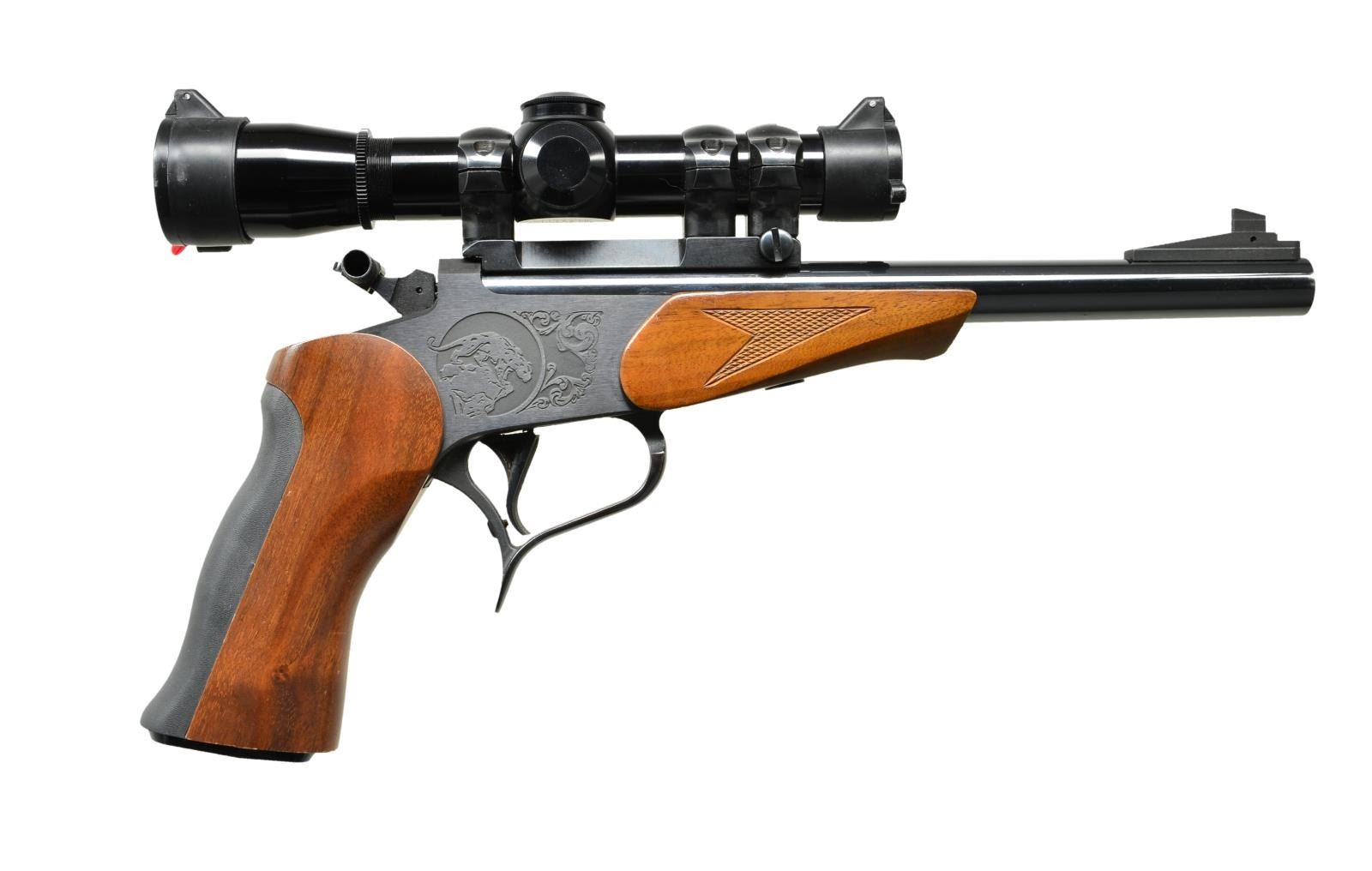 SET. Cal. 44 Mag. S# 81014. Bbl. 10" round w/ screw on front sight & Redfield triple ring base holding gloss finished Leupold M8-2X EER duplex reticle scope having Butler Creek flip up lens caps. Mfg. 1st half of 1978. Checkered walnut forend, steel hammer extension, 2 piece locking bolt & smooth walnut grip having recoil absorbing rubber backstrap & logo plastic grip cap. UNATTACHED ACCESSORIES: 4 rnd. 10" bbls. w/ adj. rear sights: 1) 22 LR w/ fixed front sight & long rear. 2) 32-20 w/ screw on front sight & late production short rear; 2 piece locking block. 3) 357 Mag. w/ fixed front sight & long rear. 4) 45 Colt / 410 w/ screw on front sight & late production short rear; internal screw in choke (wrench included). Also includes russet colored TC logo holster designed for scoped 10" pistol; very good to excellent overall. CONDITION: all aspects of entire set including finish; optics & bores are near excellent. (22-3760/NW). MODERN. $1,000-1,500.