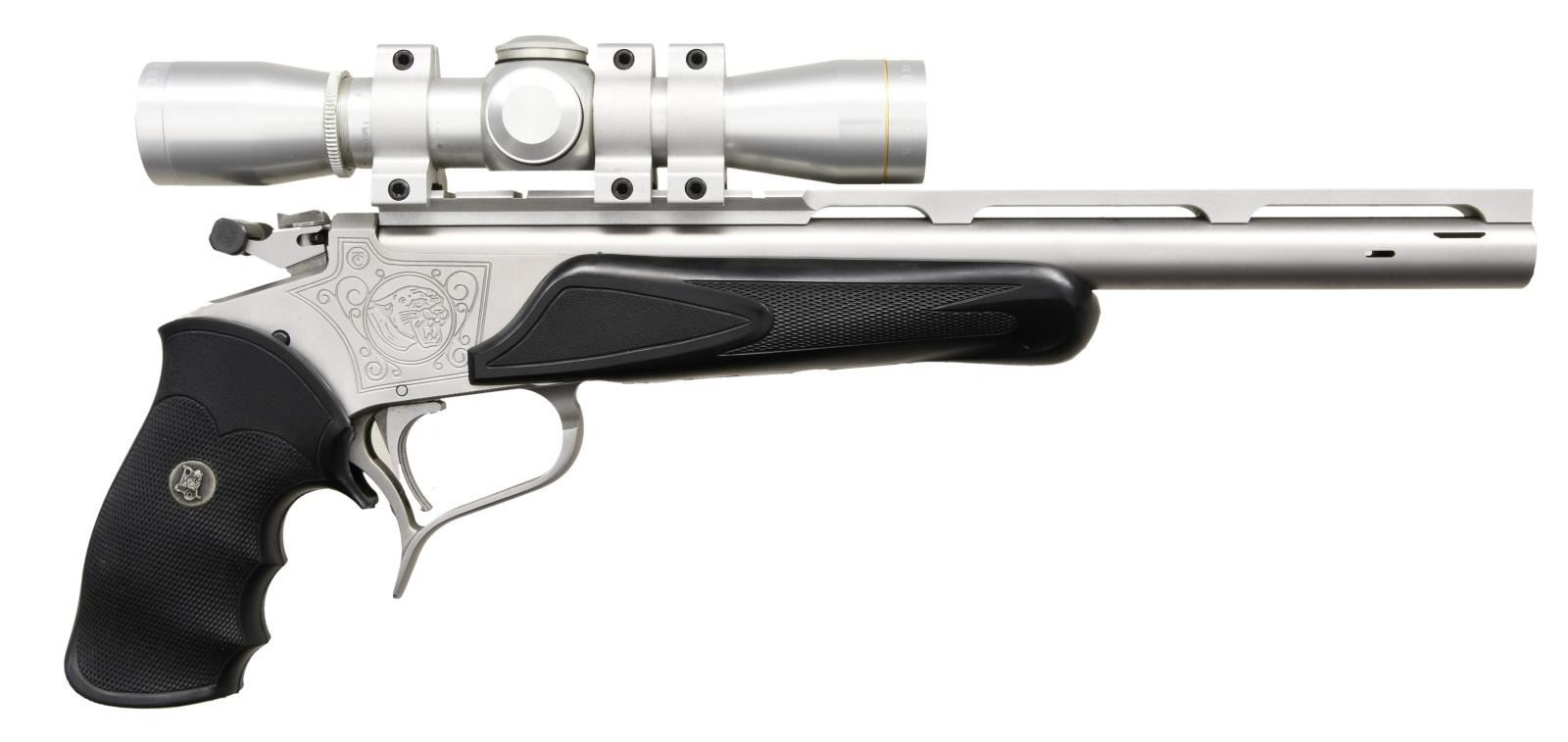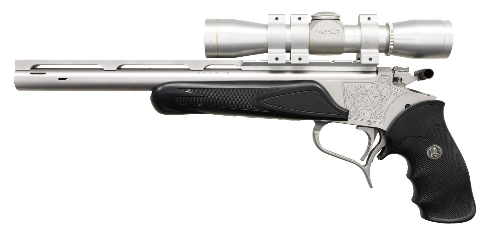 CUSTOM SSK BARREL. Cal. 45-70. S# S9151. Bbl 12 1/2". Contender single shot pistol manufactured by Thompson Center Arms. Left side of barrel is marked "S S K 45-70". Left and right sides of receiver are laser engraved with a portrait of a cougar. Custom SSK 45-70 Government barrel with aluminum vent rib / picatinny rail that is mounted with a 3 ring Leupold M8-4x Extended E.R. scope. Stainless steel finish with black checkered rubber Pachmayr grip and forend. CONDITION: very good overall, with metal components exhibiting few minor superficial handling marks overall. Mirror bore, exhibiting strong rifling throughout. Pachmayr furniture shows some handling marks, but is otherwise good overall. Exterior fo scope shows some marks from handling and storage. Scope retains a clear and sharp optic. (23-2532/MLW). MODERN. $900-1,300.