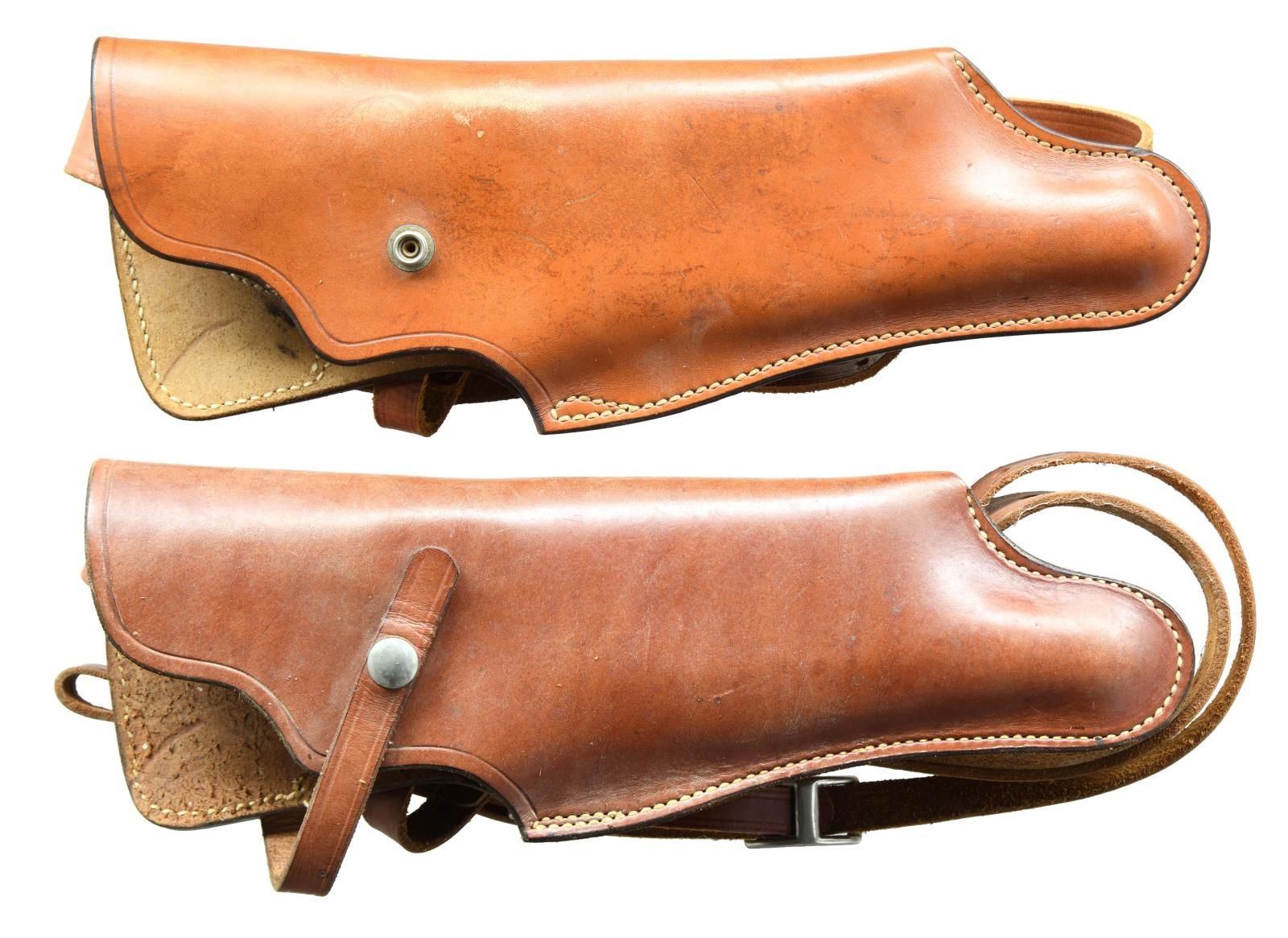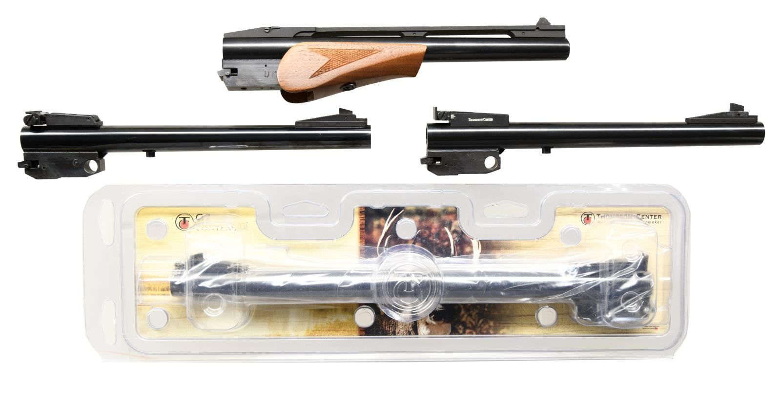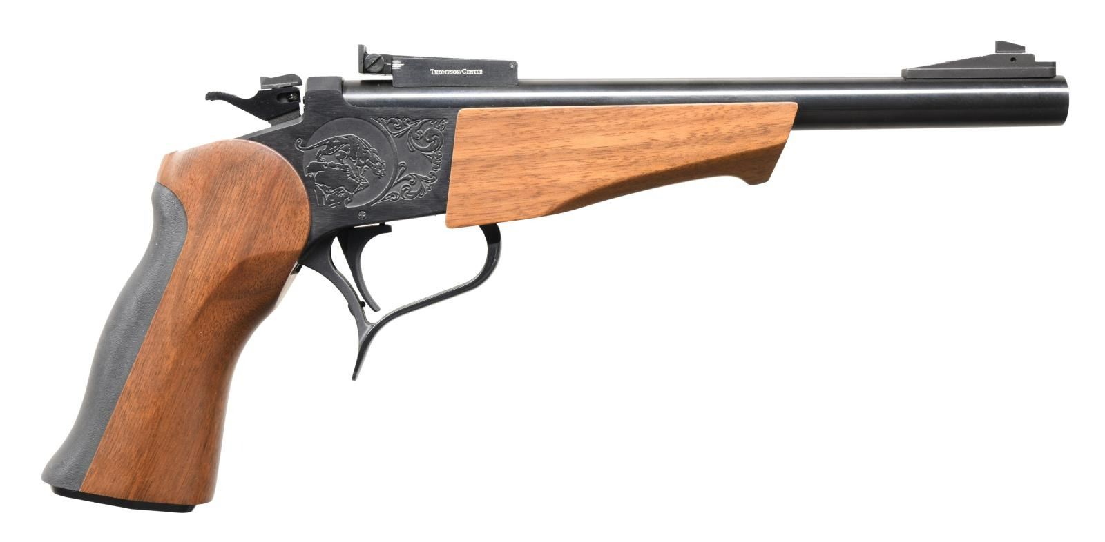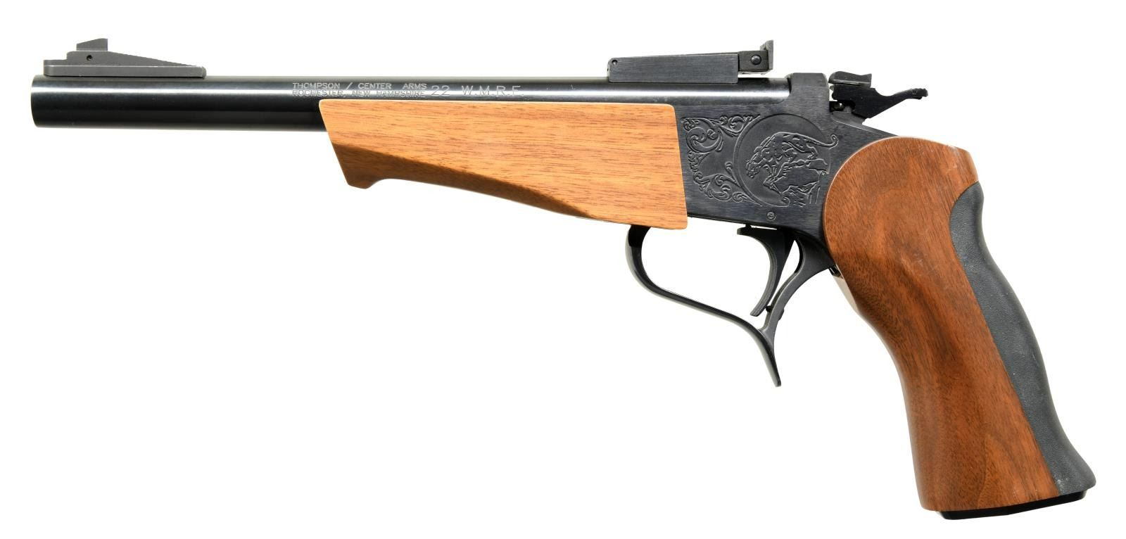 DESIRABLE ASSORTMENT OF ACCESSORIES. Cal. 22 WMRF. S# 399722. Bbl 10". Contender single shot pistol manufactured by Thompson Center. Left side of barrel is marked with the manufacturer information, followed by the caliber designation. Engraved scene of a mountain lion on left and right of frame. Metal components exhibit a blued finish. 1 Piece wood stock with black rubber rear panel, and a smooth wood forend. UNATTACHED ACCESSORIES: box containing factory paperwork, 1 .44 Magnum barrel, 1 .22 LR Match barrel (with box), 1 .45/410 GA barrel (with box), as well as .223 Remington barrel in its plastic packaging. Also includes 2 Thompson Center leather shoulder holsters for 10" bbls. Both holsters show light wear & handling marks, 1 has some mildew spots. CONDITION: very good overall, with metal components retaining the vast majority of their original factory blue finish. Mirror bore, exhibiting well defined rifling throughout. Wood furniture shows a few minor marks from storage and handling, but is otherwise fine. Boxes all show mild exterior wear and remain sturdy and serviceable. (23-4677/MLW). MODERN. $750-1,250.