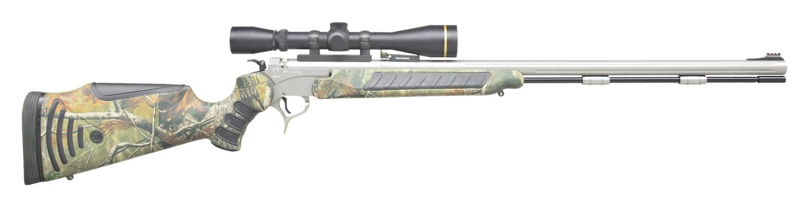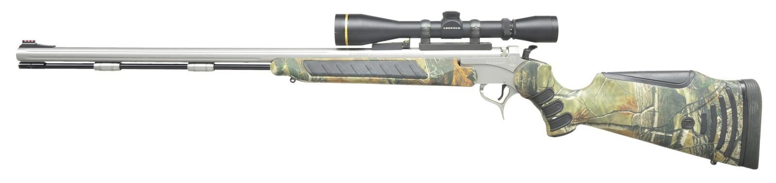 SHOT RIFLE. Cal. 50 (uses 209 primers). S# 584056. Bbl. 26" fluted w. red fiber optic front & green fiber optic rear sights. Leupold Ultimateslam 3-9x40mm scope w/ rangefinding duplex reticle on Leupold style rings & 1 piece base on bbl. Stainless finish. Encore Pro Hunter frame. Synthetic Hardwoods camo finish. w/ recoil pad. Black synthetic ramrod. CONDITION: near excellent overall appearance including bore. (22-2692/MD). MODERN. $500-750.
