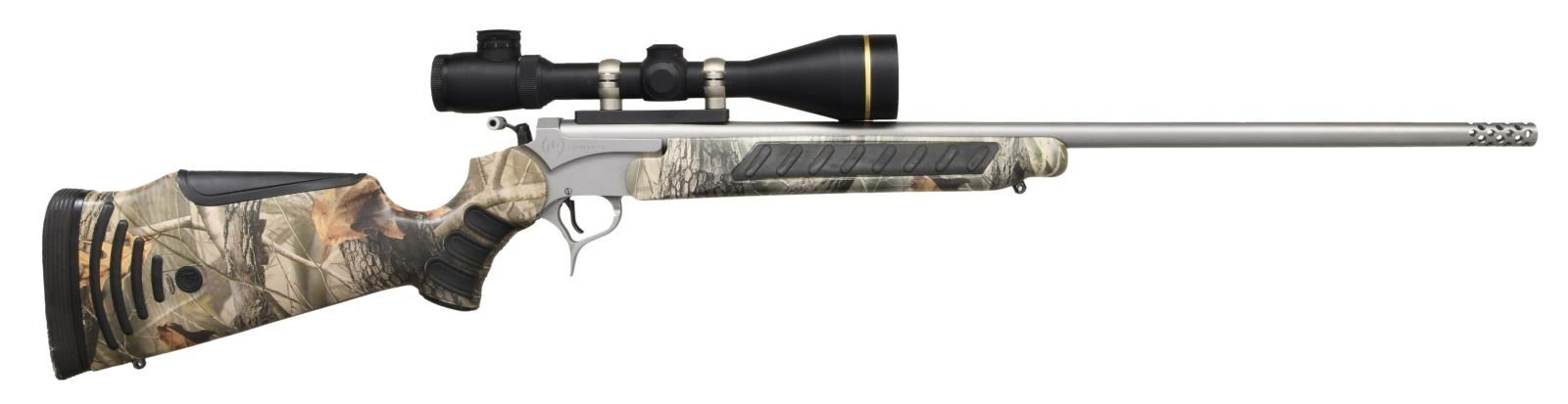 RIFLE WITH SCOPE. Cal. 45-70. S# PS81462. Bbl 26 1/4". Encore Pro Hunter manufactured by Thompson Center. Standard markings on left side of barrel with "ENCORE" on the left side of the frame and "PRO/ HUNTER" on the right. Stainless steel finish with Realtree Hardwoods camoflauge polymer stock and forend. Integral muzzle brake. Receiver is mounted with a Leupold Vari-X III 3.5-10x50mm scope. CONDITION: very good overall, with metal components exhibiting few superficial handling marks. Mirror bore, exhibiting well defined rifling throughout. Polymer furniture shows a few marks from handling and storage, but is otherwise very good overall. Scope retains a clear and sharp optic. (23-2526/MLW). MODERN. $700-1,000.