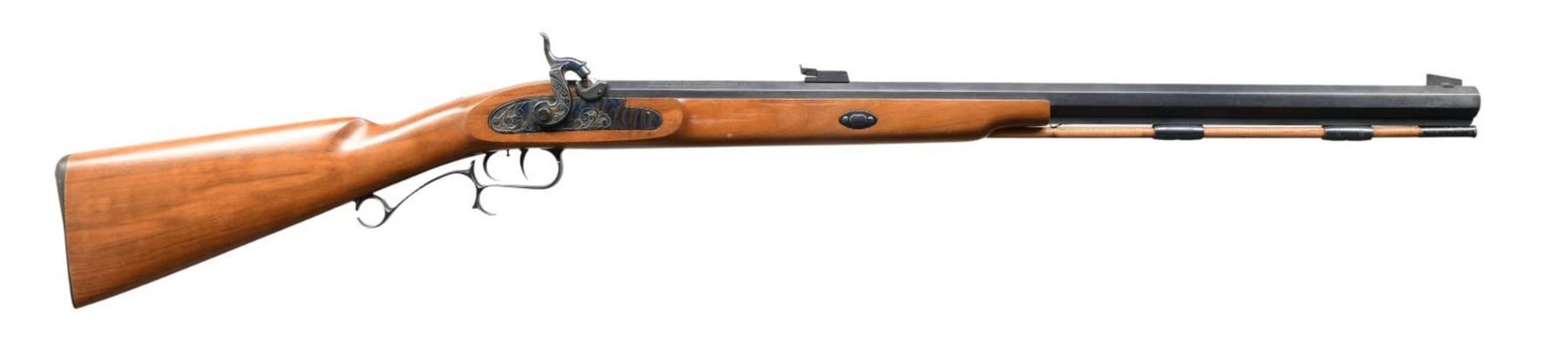 Cal. 54. S# 25392. The octagon 26" barrel has open sights. Case hardened lock & hammer; blued barrel & small parts. Double set triggers. Walnut wedge fastened stock with ramrod. CONDITION: near excellent blue with couple spots of oxidation & light wear. Very good wood finish with scattered marks. Very good shiny bore. (01-25226/MD). ANTIQUE. $300-400.