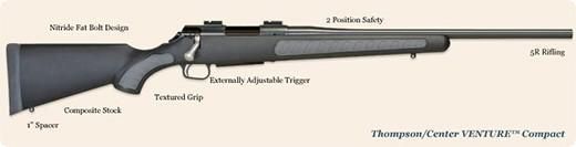 TC5348 PRODUCT DETAILS FAMILY:Venture Series MODEL:Venture Compact TYPE:Rifle ACTION:Bolt Action FINISH:Blue STOCK/FRAME:Synthetic Stock CALIBER/GAUGE:243 Win CAPACITY:3+1 BARREL:20" OVERALL LENGTH:39.75" with spacer SIGHTS:None