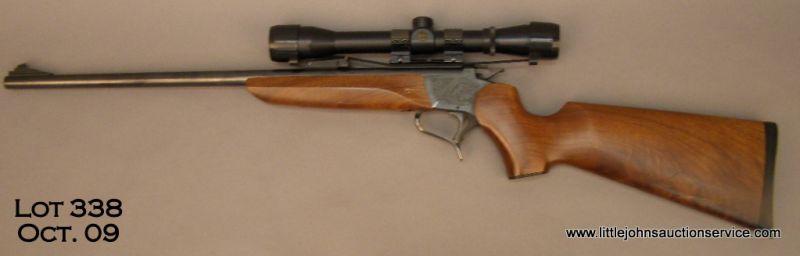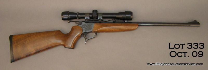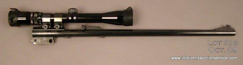 THOMPSON Contender Carbine rifle, # 394201, .30-30 cal, 21” barrel, smooth walnut stock. Excellent condition overall showing over 95% original finish, stock is in very good condition, showing a few minor gouges from storage. Mounted with aNichols 4X32 scope. Includes an extra 21” barrel in .223 Rem., mounted with a Bushnell Sportview 3X9 scope. Est. $200-$400.