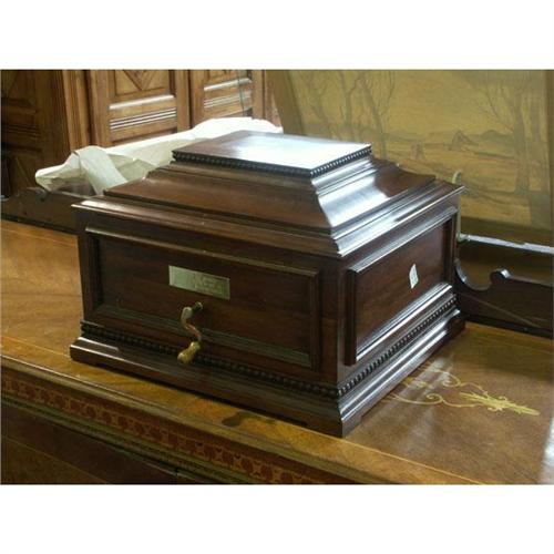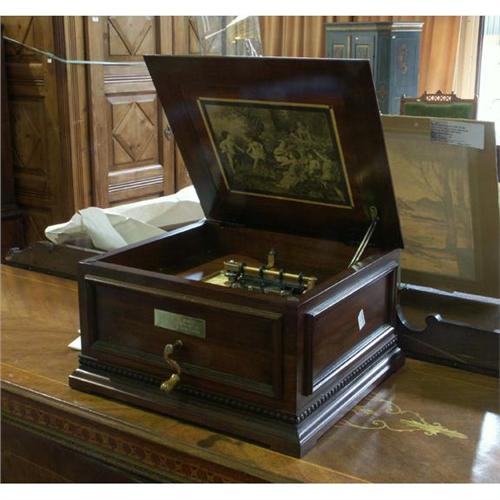 MUSIC BOX: Thorens mahogany music box with key, Swiss works, late 20th c. Untested, note ''teeth'' missing. 18.25'' x 16'' x 12.5''