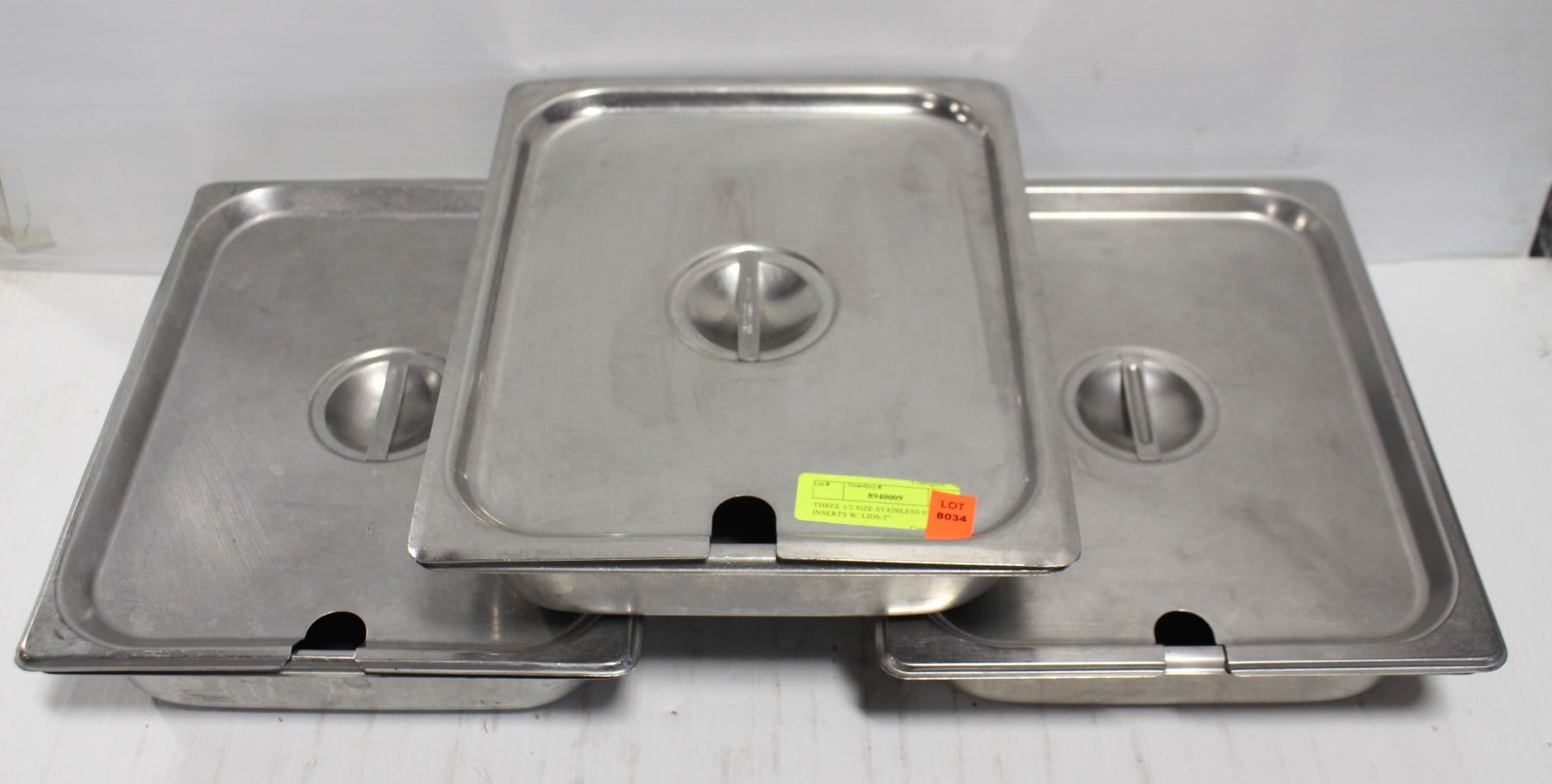 THREE 1/2 SIZE STAINLESS STEEL INSERTS W/ LIDS-2"