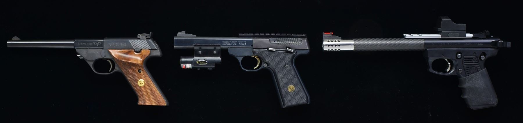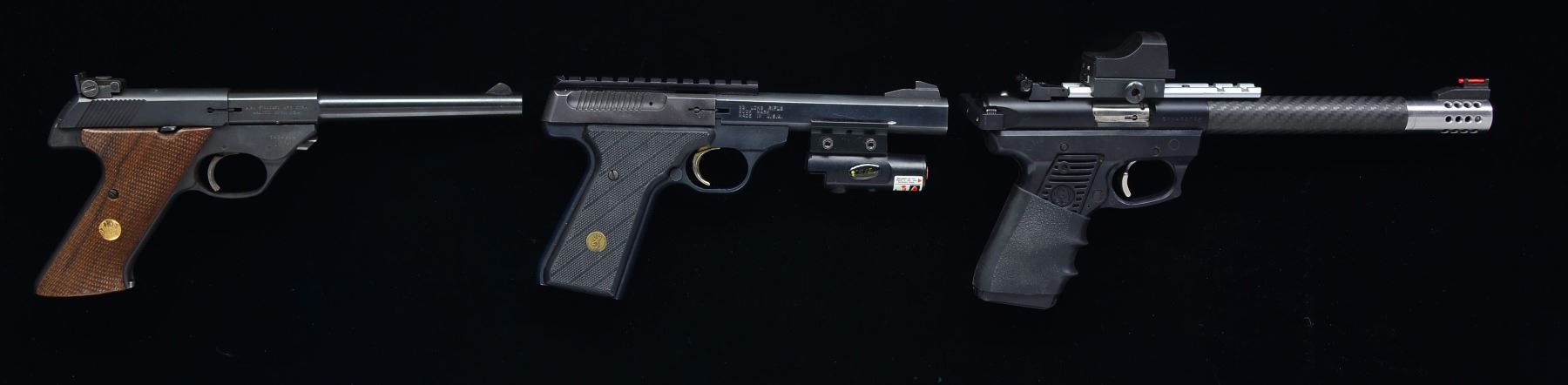 1) HI-STANDARD MODEL 103 SPORT KING. Cal. 22 LR. S# 1608714. Bbl. 6 3/4�. Medium weight bbl. w/ combination matte finish frame & slide w/ polished bbl. Walnut target grips w/ gold medallions & thumb rest. Lightly beveled mag. well. This version utilizes a button in front of the trigger guard for quickly changing bbls. to suit specific purposes. Front sight blade, rear fully adj. target sight. MAGS: 1-10 rd. UNATTACHED ACCESSORIES: 2 spare bbls., 1st spare being 5 1/2" w/ white insert front sight blade plus integral muzzle brake & 2nd spare being a 9" (over brake) slotted target bbl. w/ weight set; accompanied by what appears to be original slide numbered to the receiver; included w/ muzzle brake alignment wrench. CONDITION: shiny bore w/ light rifling, bbl. finish is still complete & markings clear, checkered grips are free of any major damage, medallions are bright & shiny, firing mechanism appears to function correctly when cycled by hand, spare bbls. both exhibit shiny bores w/ decent rifling. (20-1008/JZ). 2) BROWNING BUCKMARK. Cal. 22 LR. S# 655NM03045. Bbl. 5 1/2". Matte finish frame w/ gloss blue bbl. 5" Picatinny rail section above slide. Heavy front blade sight. Gold trigger. Slide lock. Plastic grips w/ gold Browning medallions. "BSA" laser aiming device mounted below bbl. in crudely cut channel. Serrated slide. MAGS: 2 metal 10-rd. & 2 plastic Ram-Line 10-rd. UNATTACHED ACCESSORIES: 1 spare set of Browning hardwood grips; spare 5" bbl.; one 11" remote control pressure switch for laser operation. CONDITION: finish is complete & free of many major flaws or blemishes, aside from the grooves that were added to the bbl. to provide a mounting surface for the included laser, no obvious blemishes to grips, action is a bit sticky but appears to function correctly when cycled by hand, bore is bright w/ sufficient rifling, secondary bbl. shows more wear externally w/ thinning & gentle patina but still retains decent bore. (20-1044/JZ). 3) RUGER 22/45 TARGET PISTOL W/ CARBON FIBER WRAPPED BBL. Cal. 22 LR. S# 225-89085. Bbl. 8 1/2" over brake. Matte black frame w/ carbon fiber wrapped bbl. & stainless muzzle brake. Fiber optic front sight fixed, rear sight adj. notch. 5" Picatinny rail on top of receiver w/ unmarked red dot sight. Extended charging handle. Thread adj. trigger stop. Rubber wrap around grips. MAGS: 6 10-rd. steel. UNATTACHED ACCESSORIES: matching numbered gray plastic case w/ blued factory scope base. CONDITION: all outward aspects appear as new, though internally evidence of use, shiny bore w/ strong rifling, red dot sight appears functional, fire control mechanism appears to function correctly when cycled by hand. (20-1058/JZ). ALL MODERN. $800-1,200.