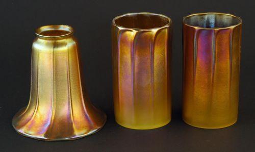 THREE AMERICAN GOLD ART GLASS SHADES one bell form, unsigned, attributed to Steuben; and a pair of Quezal cylinder form, signed, approximately 6" high each