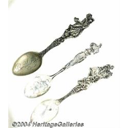 <B>THREE AMERICAN SILVER WESTERN SOUVENIR SPOONS</B></I><BR>Various makers, c.1900<BR><BR>Three western theme souvenir spoons, <I>marked sterling reverse of handles</B></I><BR>the longest, 5.5in. 3 Items <BR><BR><B>Important notice:</B> Heritage usually auctions material at the rate of 200-250 lots per hour. On some occasions eBay Live bid software or the Internet may not be able to keep up with the pace of the auction. We recommend placing a realistic absentee bid now as insurance to avoid disappointment. Occasionally the auctioneer may eliminate or reject an eBay Live bid, and the auctioneer may also reopen a lot after the close of the eBay live bidding (usually because we missed an audience bid), and may reject your bid even if it shows you as the winning bidder. By bidding via eBay Live, you agree that Heritage may award the lot to another bidder at its sole discretion under the circumstances described above or any other reasonable circumstances. Since eBay bids are not shown to us until we open the lot on the floor, we treat those bids just like floor bids. In most cases the floor responds before the eBay bid is presented to us, due to Internet lag time, so for consistency we have made it a policy that floor bids are always considered first over tie eBay live bids. Also please note that all Heritage lots purchased through eBay Live carry a 25% Buyer's Premium. Please make sure you read the Terms and Conditions before you bid. <BR><BR><B>IMPORTANT ANNOUNCEMENT ABOUT RESERVES:</B> Heritage now divulges all reserves on its web site 7 days before every auction. If you want to know whether the reserve on this lot has been met, and if not, what the reserve amount is, please visit this lot page on the HeritageCoin.com web site, or email: bid@HeritageGalleries.com </span></font>