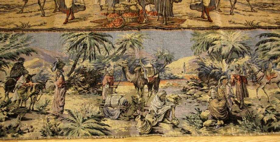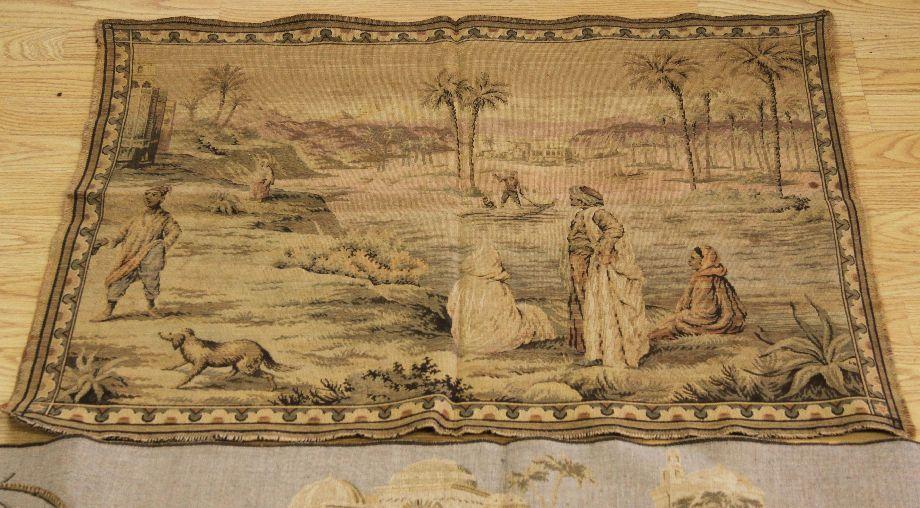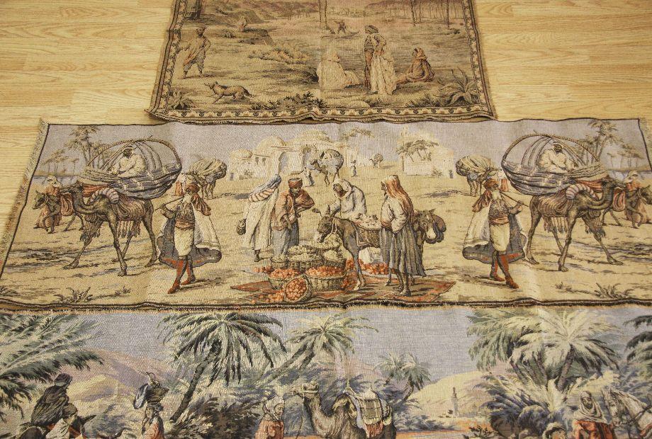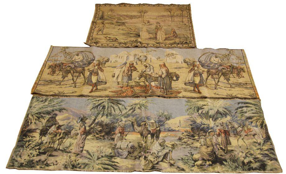 Two tapestries measure 19 by 55 inches and are Belgian type with Arabian scenes of market and water gathering. Both are in very good condition with vibrant colours. Third is older, monochromatic, 25 by 32 inches Arabian waterfront theme. Some soiling commensurate with age.