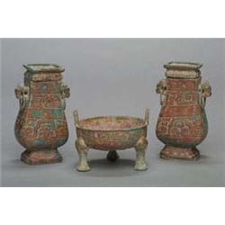 Set of three Chinese, Eastern Chou Dynasty, archaic bronzes: pair of covered vessels (hu) with stylized dragon bands and animal-head loose ring handles (small flaws and possible fills to covers); both H: 7 5/8"; and a tripod censer (ting) with squared scroll designs; D: 6"; (all cleaned); with metal test results