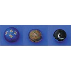 Lot 141 THREE ART GLASS PAPERWEIGHTS. 1) 1975 Orient & Flume surface decorated paperweight with floral decoration, signed and dated. SIZE: 2” dia. 2) 1992 John Lotton cased paperweight with a internal decoration of pink and green swirls, signed and dated on base. SIZE: 3” dia. 3) Signed Correia surface decorated paperweight with a moon and sea decoration. SIZE: 2-1/2” dia. CONDITION: All three are in very good to excellent condition. 5-69039-608 (200-400)
